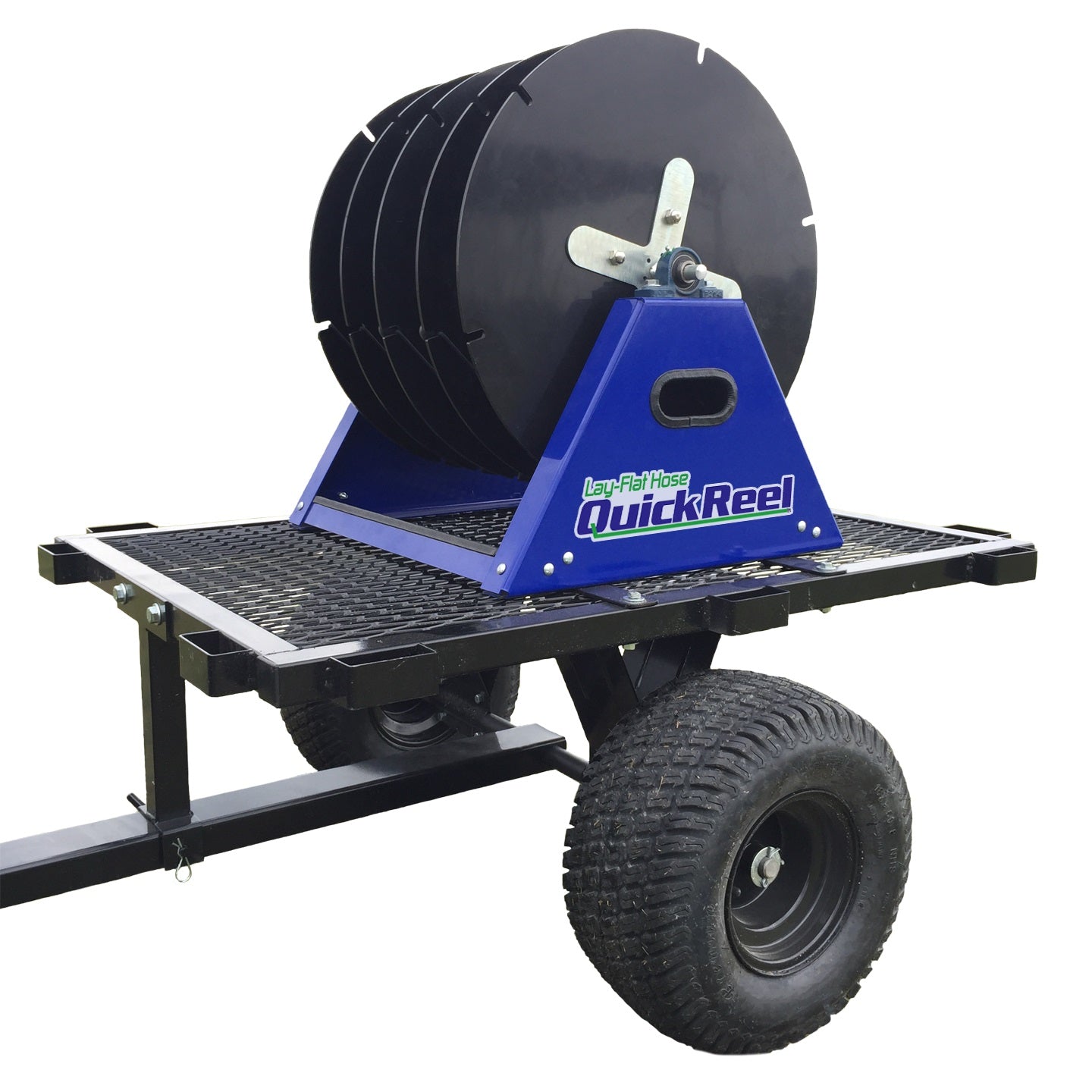 FREE FREIGHT - In continental USA! The Quick Reel Lay Flat Irrigation Hose with Trailer Package for sale will bring the mobility you need to easily transport your hose wherever you need it. The trailer has a sturdy 34 in. x 48 in. expanded metal deck with 16 gauge steel tube frame supports up to a 1000 lb. load and tilts upon removal of cotter pin. With it's large 18" ATV wheels it will be able to travel over any type of terrain. The hitch pin on this hose reel for flat hose can be used with an ATV or UTV to pull the trailer. Trailer assembly required. (Trailer not sold individually)