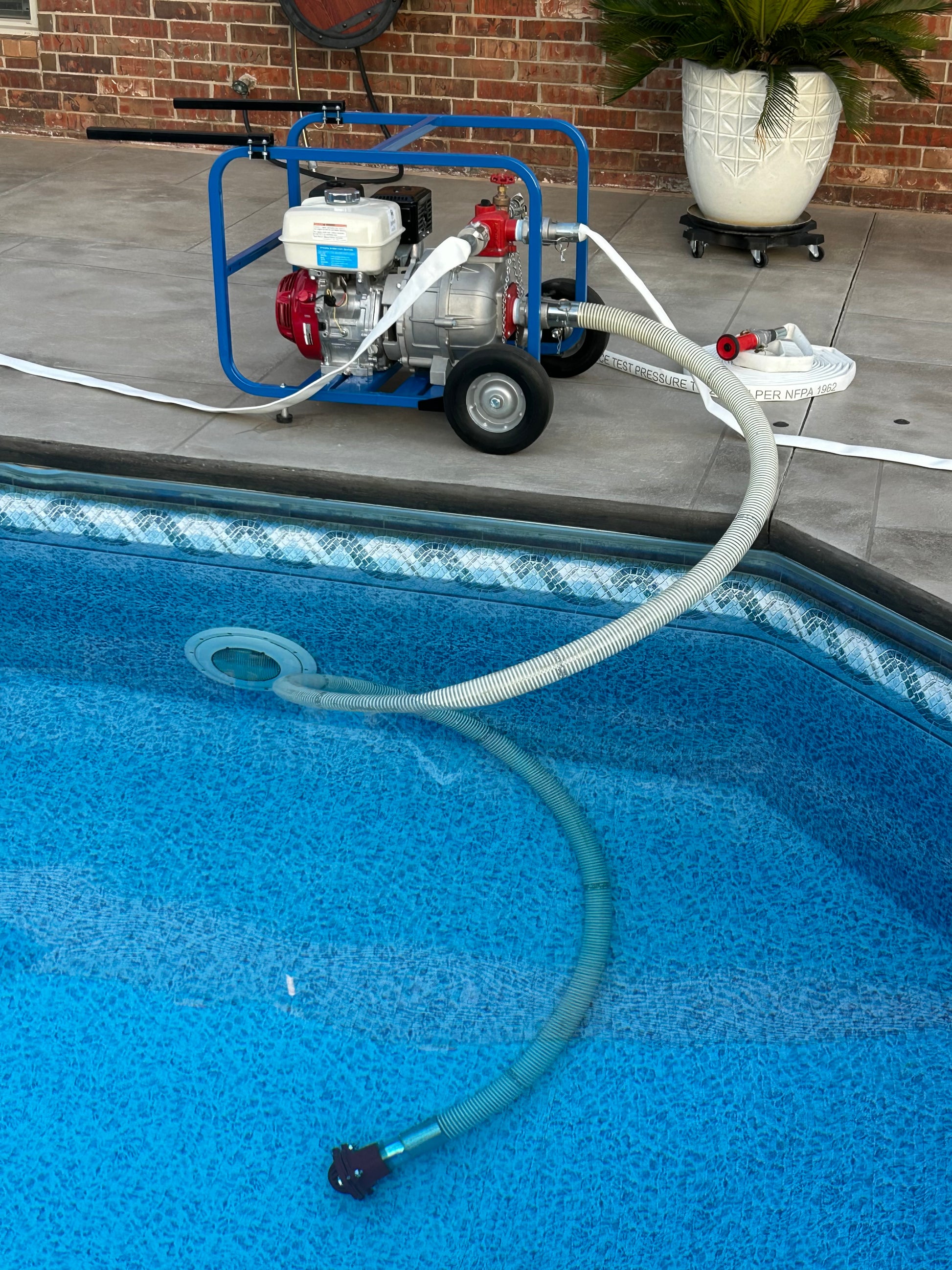 The 9HP High Pressure Fire Fighting Kit comes ready to set up and start wetting down your property quickly. This emergency kit is tailored for customers that have access to a water supply such as a pool, pond, tanks or a high volume water supply line to feed into the pump. This set-up is designed to provide coverage from (2) 1250K sprinkler carts and (1) hand line for the 1" fog nozzle for spot coverage.
