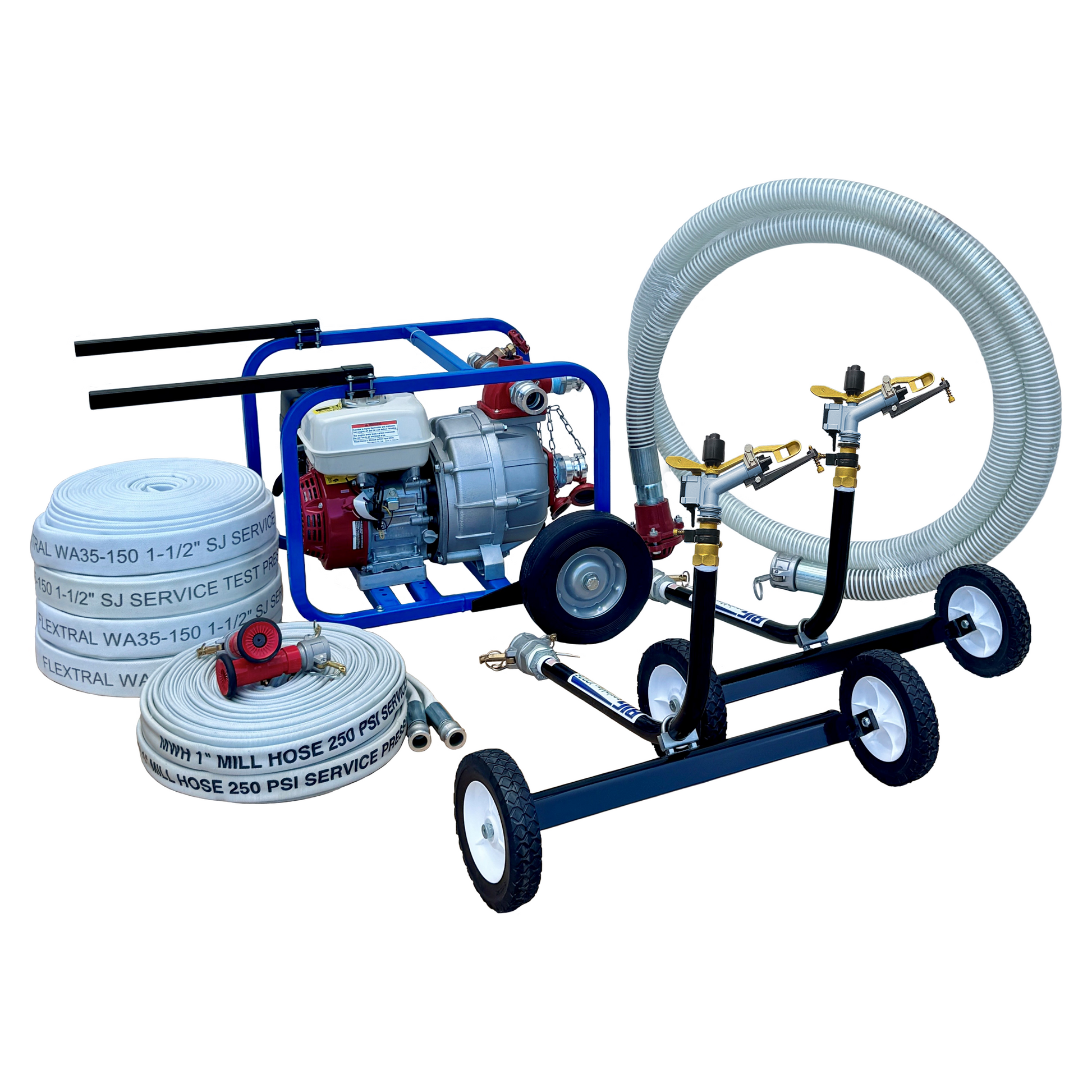 Designed for drawing water from a pool, pond, reservoir, or a large stream, this kit gives you everything you need to set up in minutes and start creating a moisture barrier with serious coverage up to 22,618 sqft with both sprinklers carts running!