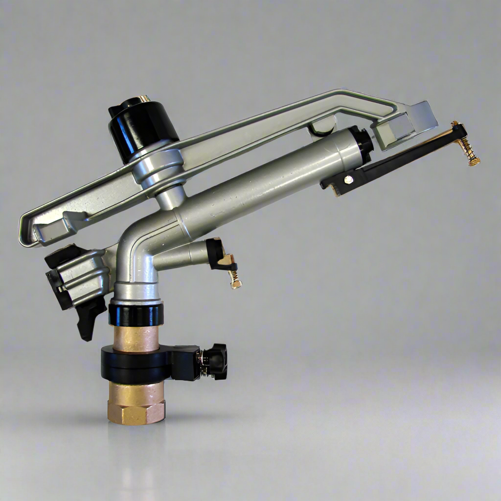The Sime Hidra 1.5" Sprinkler is constructed with a heavy-cast aluminum body, aluminum drive arm, and brass lower turning union. Features of the Sime Hidra Sprinkler include: adjustable stops for full or part circle coverage, an adjustable jet breaker for changes stream pattern, and a quick change nozzle setup; all supported by a 1 1/2" female standard pipe thread connection. The Hidra Sprinkler is a dual port sprinkler with a secondary stream nozzle located just on the underside of the main barrel to cover close and intermediate ranges. The Sime Hidra 1.5" Sprinkler includes a set of nozzles to accommodate 30 to 140 gallons per minute and coverage up to 225 feet in diameter! The Hidra Sprinkler is the featured sprinkler on our model Portable 1500H Irrigation Sprinkler Cart with Wheels.