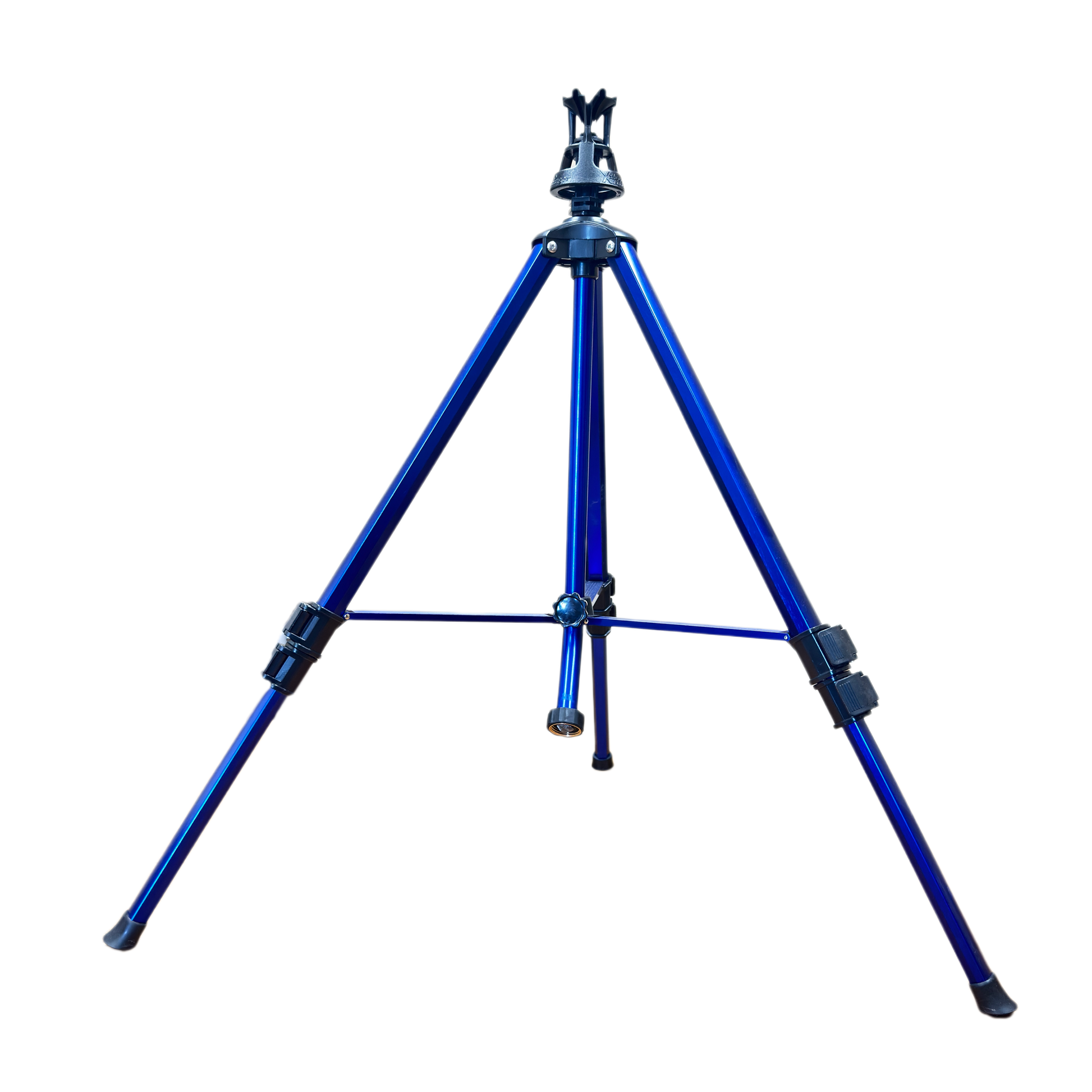 This combination includes our metal telescoping tripod stand with weighted legs for added stability. The tripod conveniently adjusts in 2 stages: from 25" to 48" in height, allowing the user to place the sprinkler above plants and shrubs for excellent coverage and uniformity. The independent telescoping legs of the tripod may be used to adjust one or two sides of the tripod to uneven terrain. It also comes with a "Goose Neck" swivel hose attachment for easy hose connection.